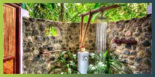 Outdoor shower with cobblestone walls and nature background for handstand retreat