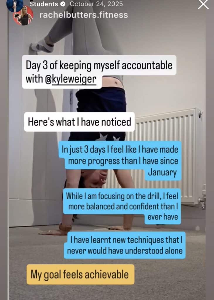 You may have tried other courses before, or even gone to handstand workshops, and not gotten much out of them. This course is the brainchild of my years of training in Yoga, Gymnastics, and Hand Balancing, and I learned all this as an adult, so I specialize in teaching adults because I remember exactly what that learning curve was like!