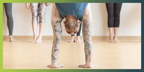 Half cropped image of coach Kyle Weiger doing handstand front view with students standing watching from a distance