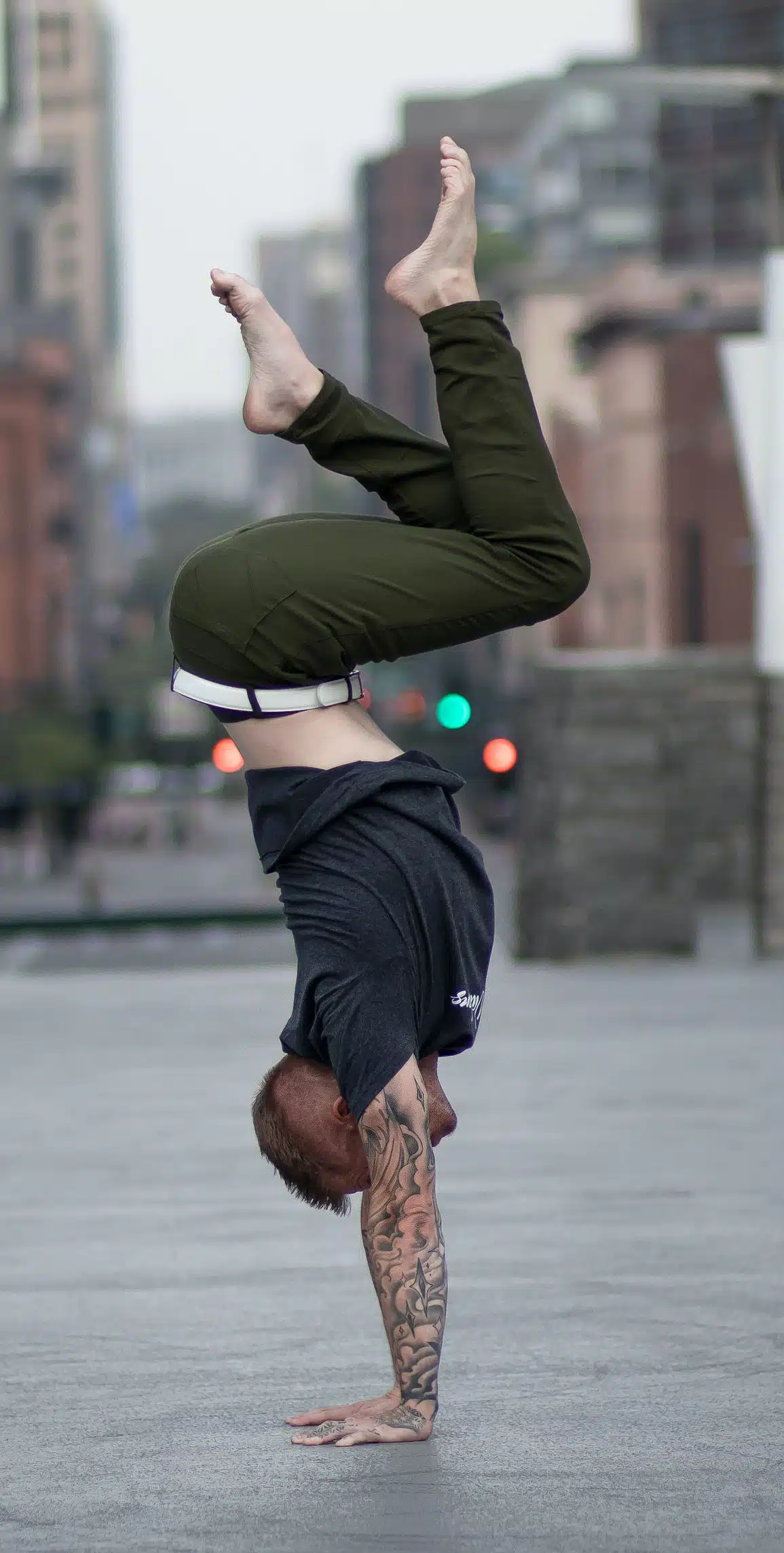Coach Kyle Weiger doing a handstand side view at the street with blurred buildings in the background