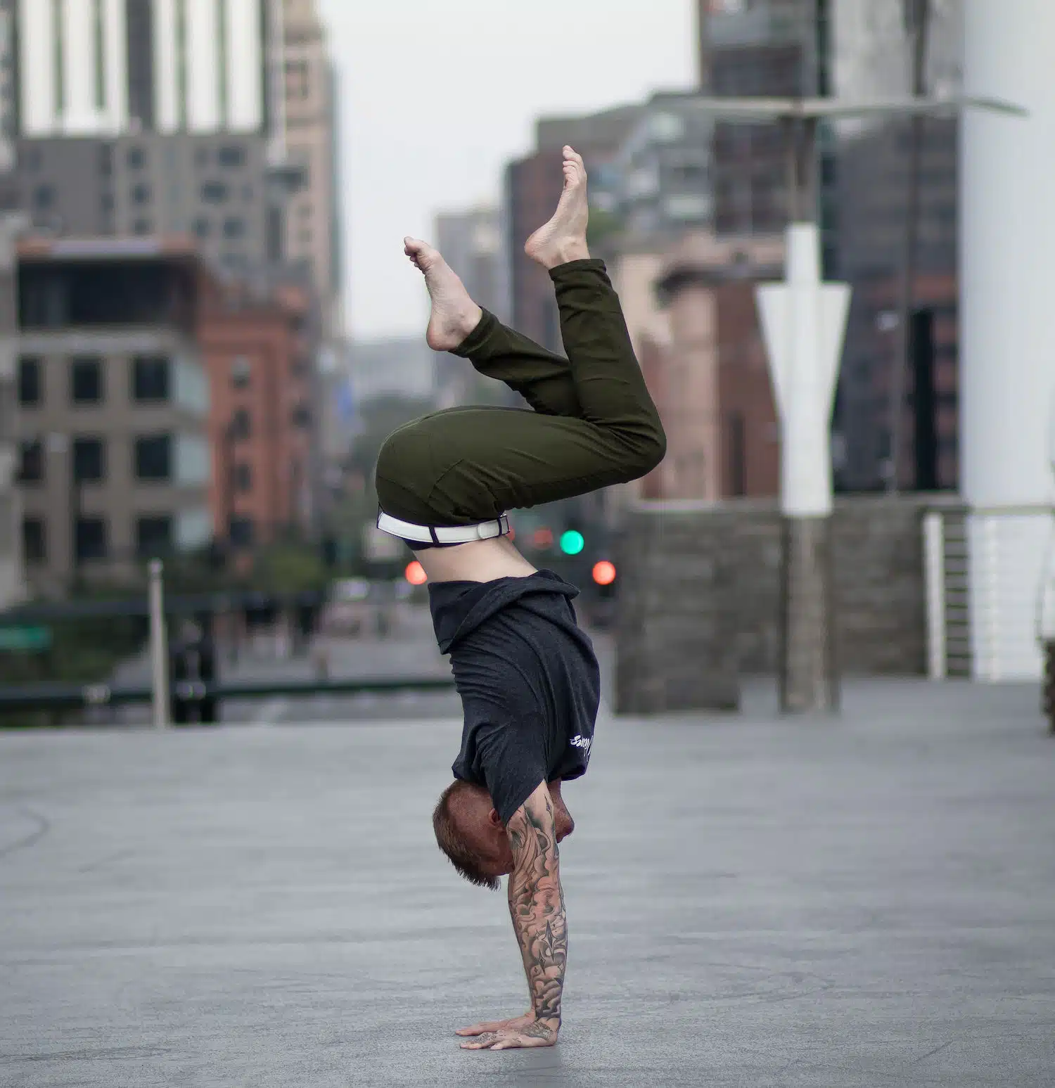 Coach Kyle Weiger doing a handstand side view at the street with blurred buildings in the background