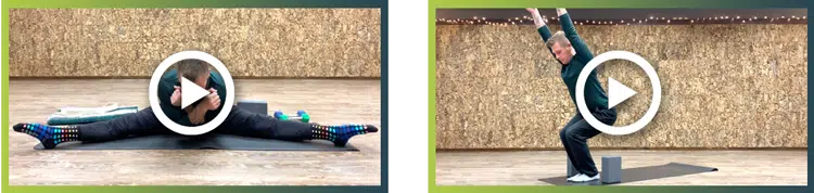 Collage of two videos of Kyle doing child pose and splits with play button for Handstand Course Yoga and Meditation