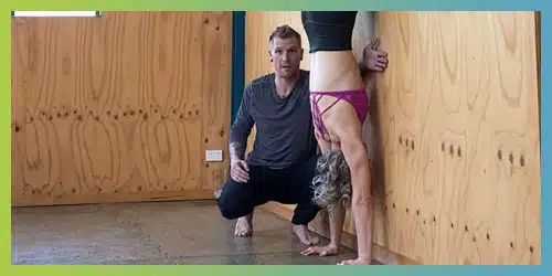 Coach Kyle Weiger assisting his student teaching how to do a handstand at the wall