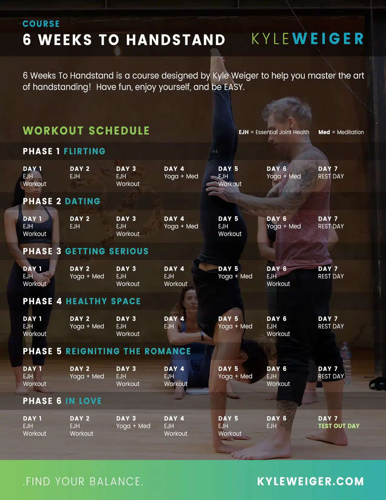 Graphic of Coach Kyle Weiger's Course Calendar Workout Schedule for 6 Weeks to Handstand course