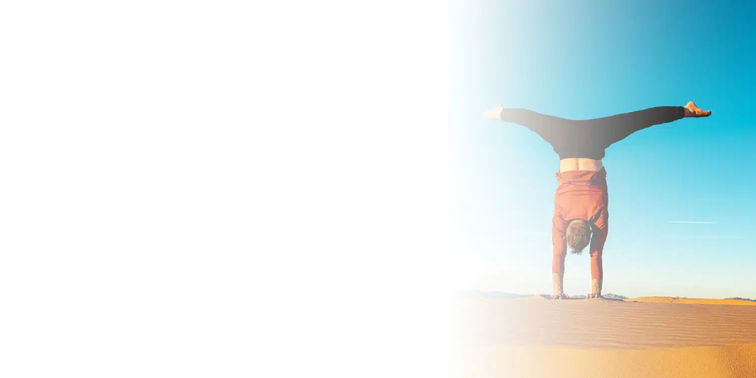 Faded picture from left to middle of Coach Kyle Weiger doing a handstand on the outdoor high altitude scenic dune background