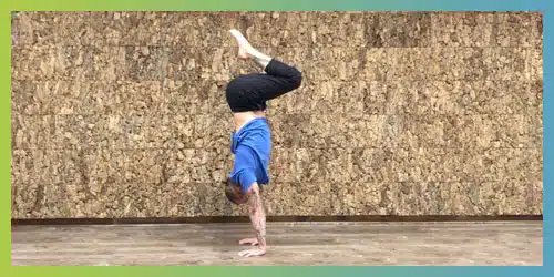 Side view of coach Kyle Weiger doing a tucked handstand taken from one of his courses