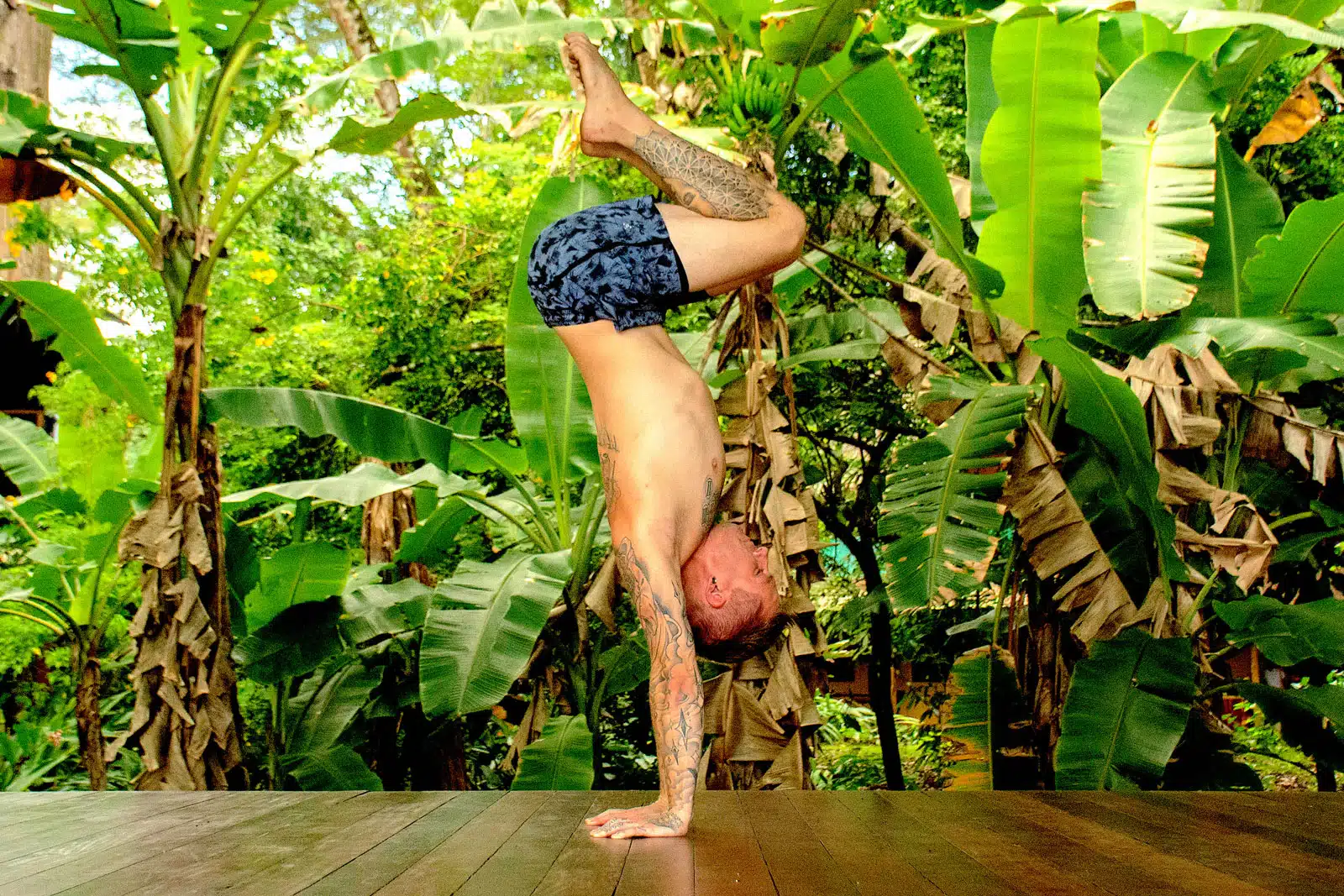 Coach Kyle Weiger doing a tucked handstand on a wooden floor with a tropical background