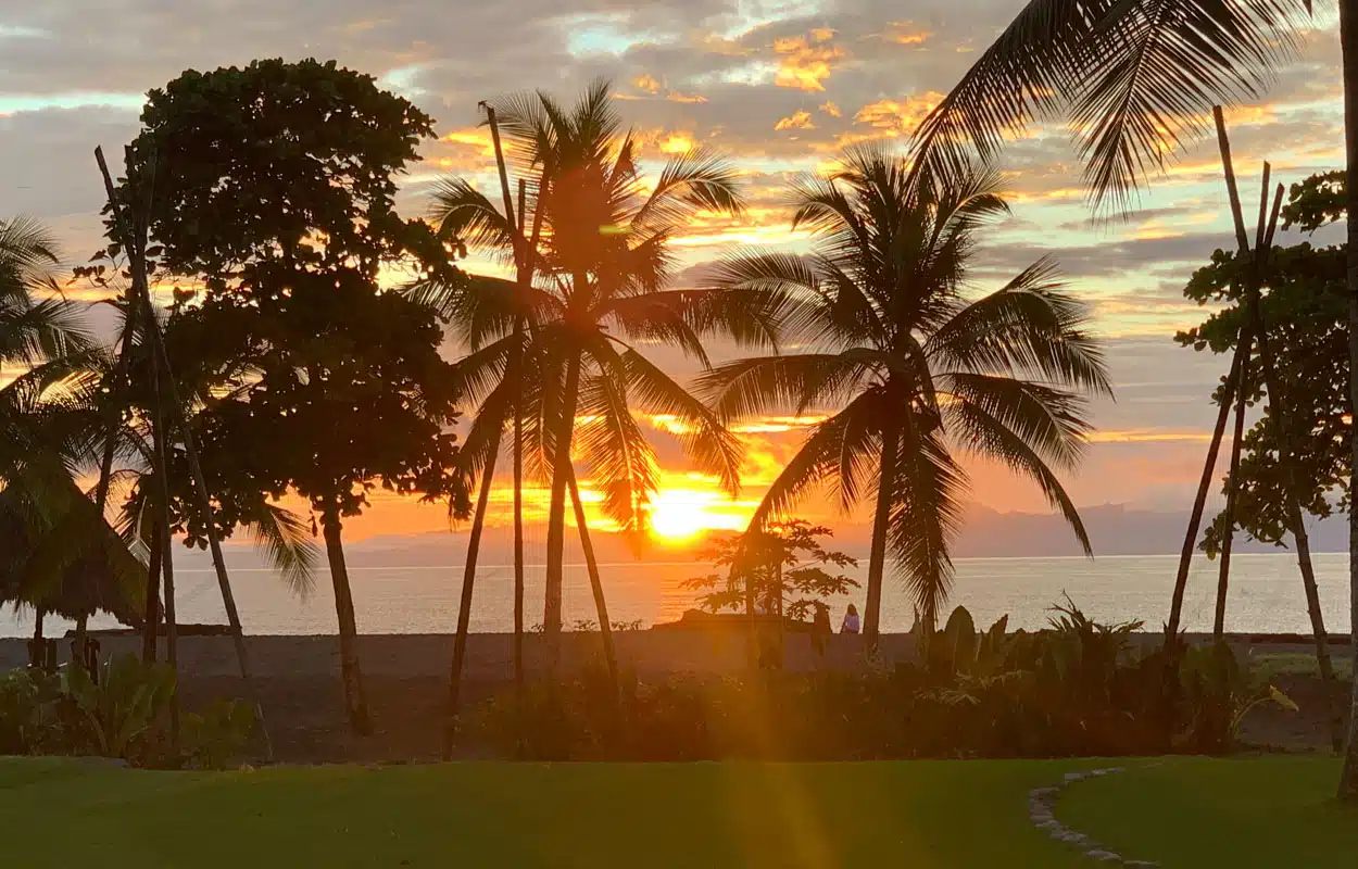 A sunset at the beach with palm trees while the sun is setting