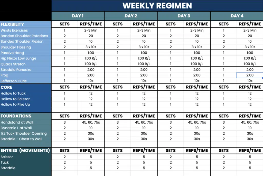 Weekly Regimen Table with Exercises and Days