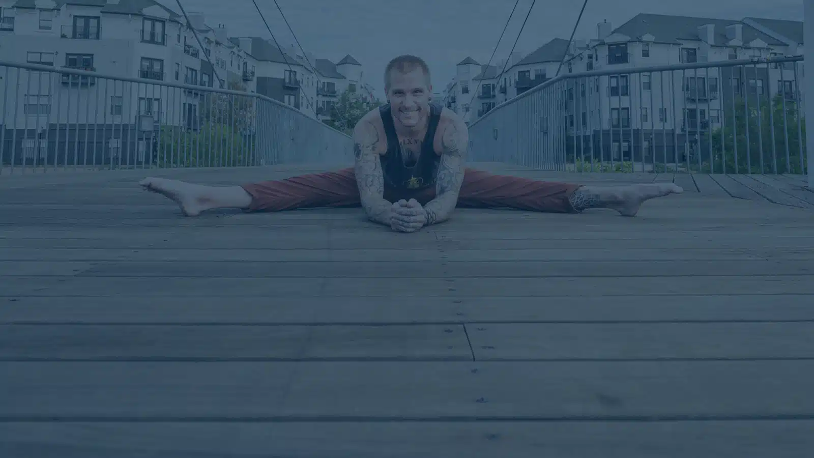 Smiling handstand coach Kyle Weiger front view splitting on wooden floor with houses on the background and teal filter