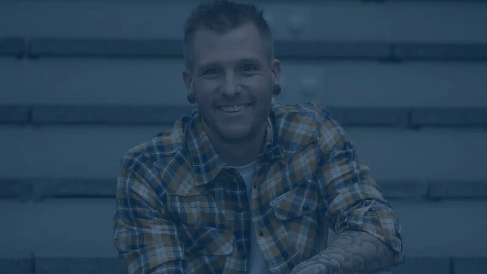 Smiling handstand coach Kyle Weiger wearing checkered polo shirt casual street photo with dark teal stripe background and filter
