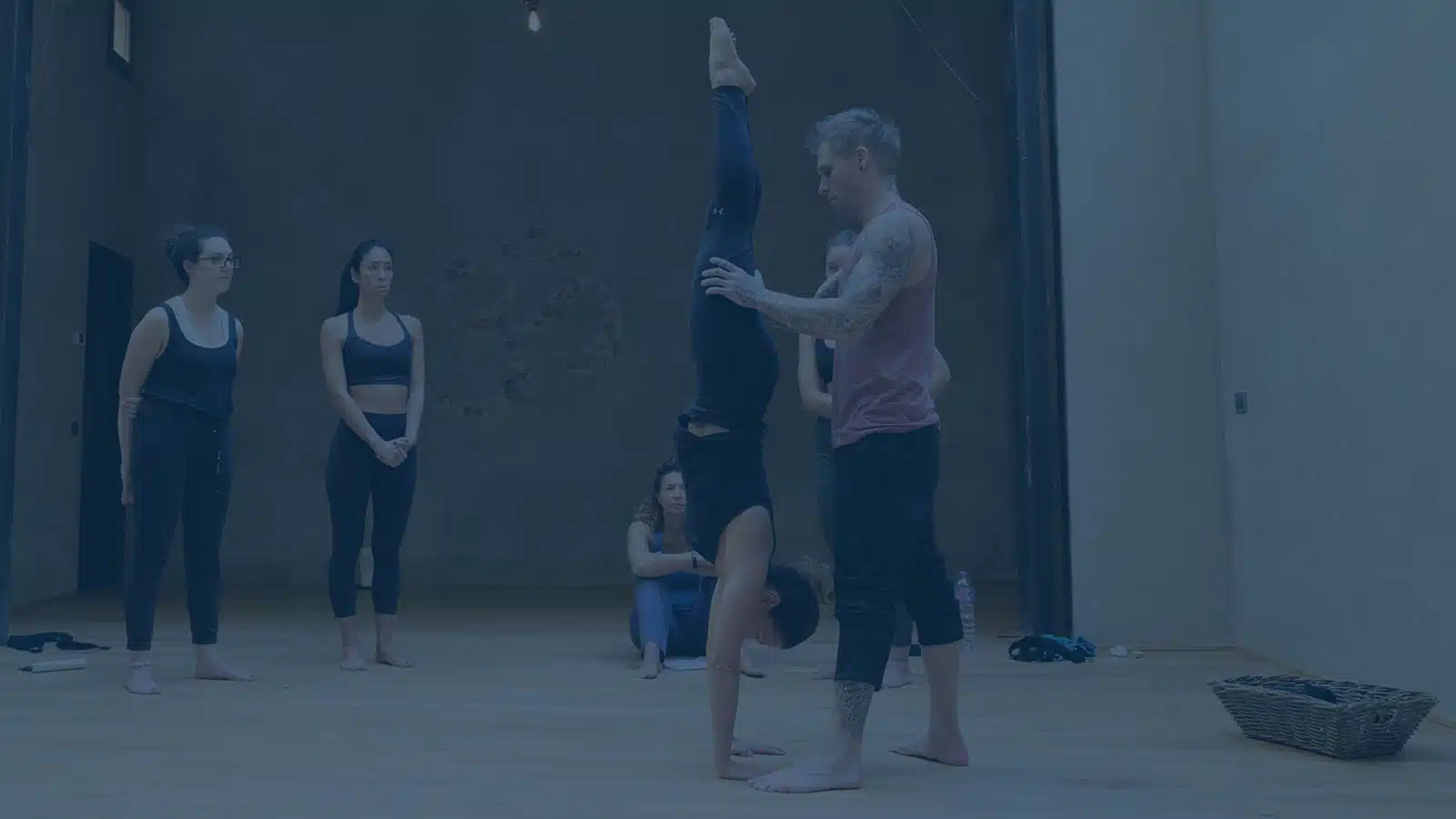 Instructor Kyle Weiger assists a girl student in the gym while others are watching with teal filter